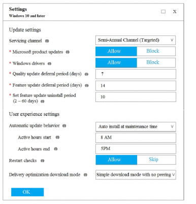 ⦁ Employees in the Los Angeles office report slow Internet performance when updates are downloading. The employees also report that the updates frequently consume considerable resources when they are installed. The Update settings are configured as shown in the Updates exhibit. (Click the Updates button.)
